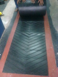 花紋輸送帶是由工作面為花紋狀的覆蓋膠和非工作面為平面的覆蓋膠與帶芯構成的傾角輸送帶。帶面上有高于帶體的“人”字型花紋,花紋可是開口也可是封閉的,每一種花紋又可分為高、中、低三種。